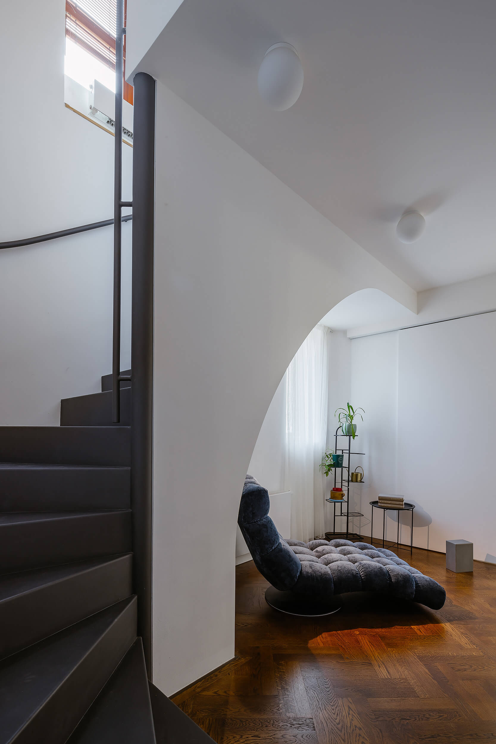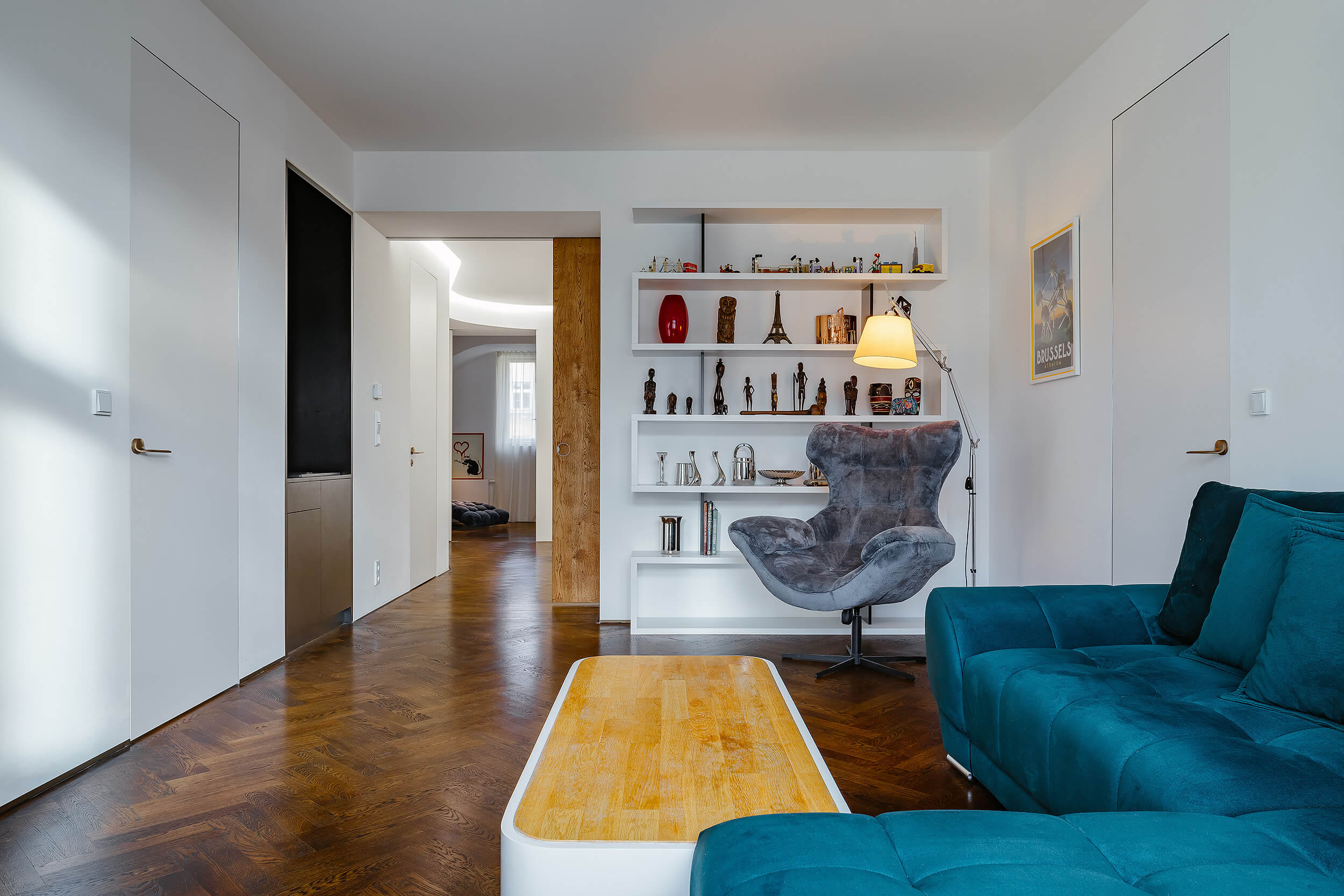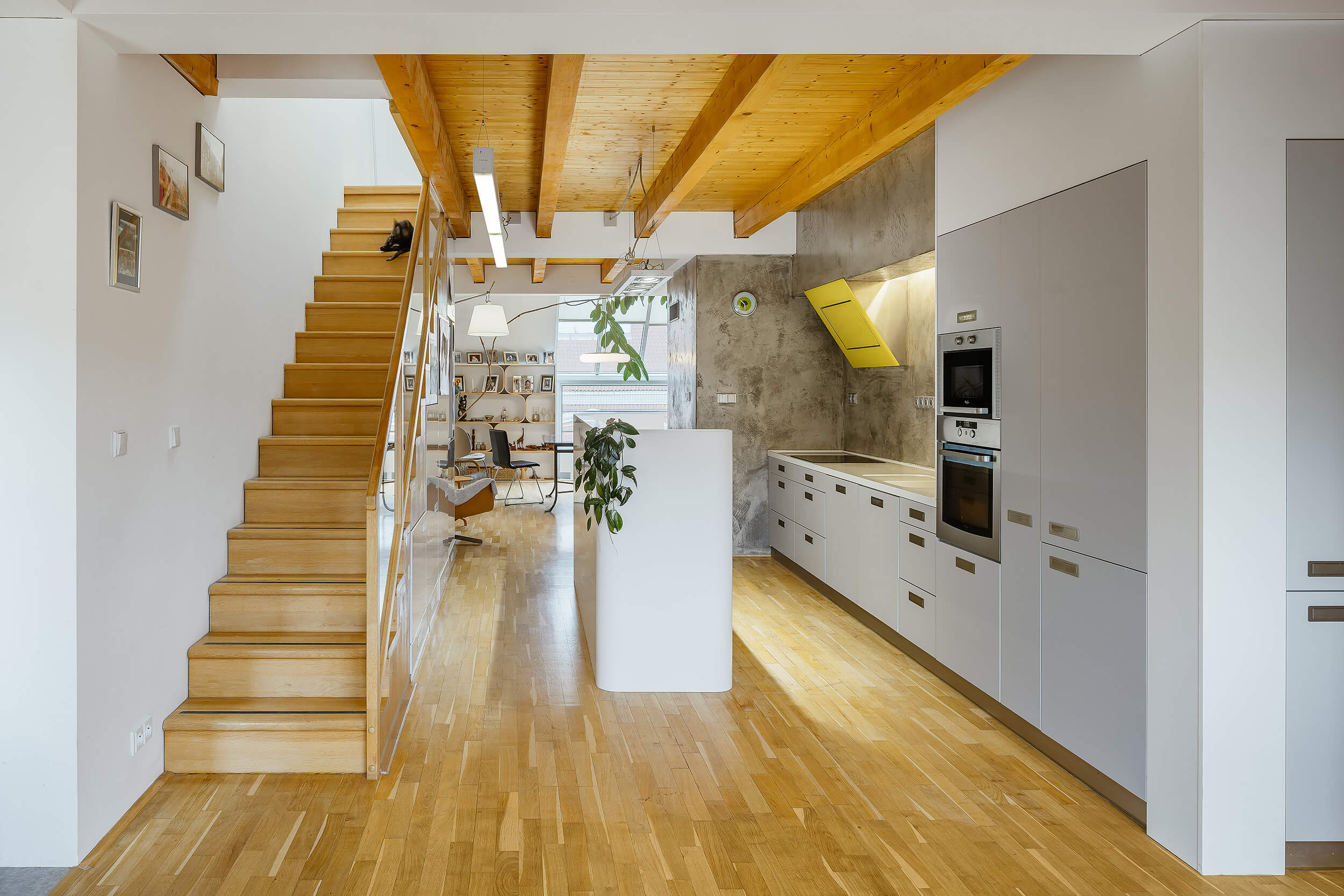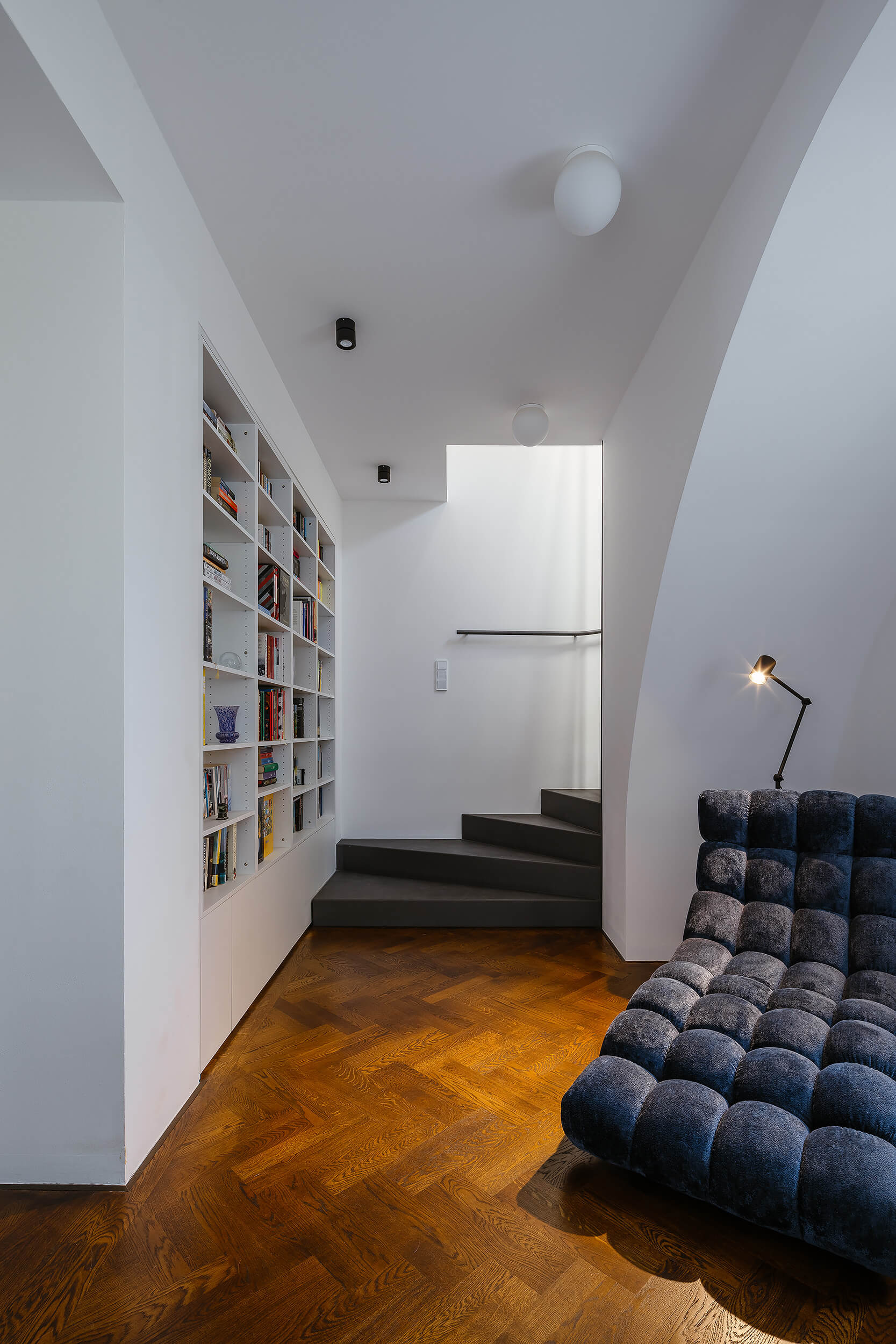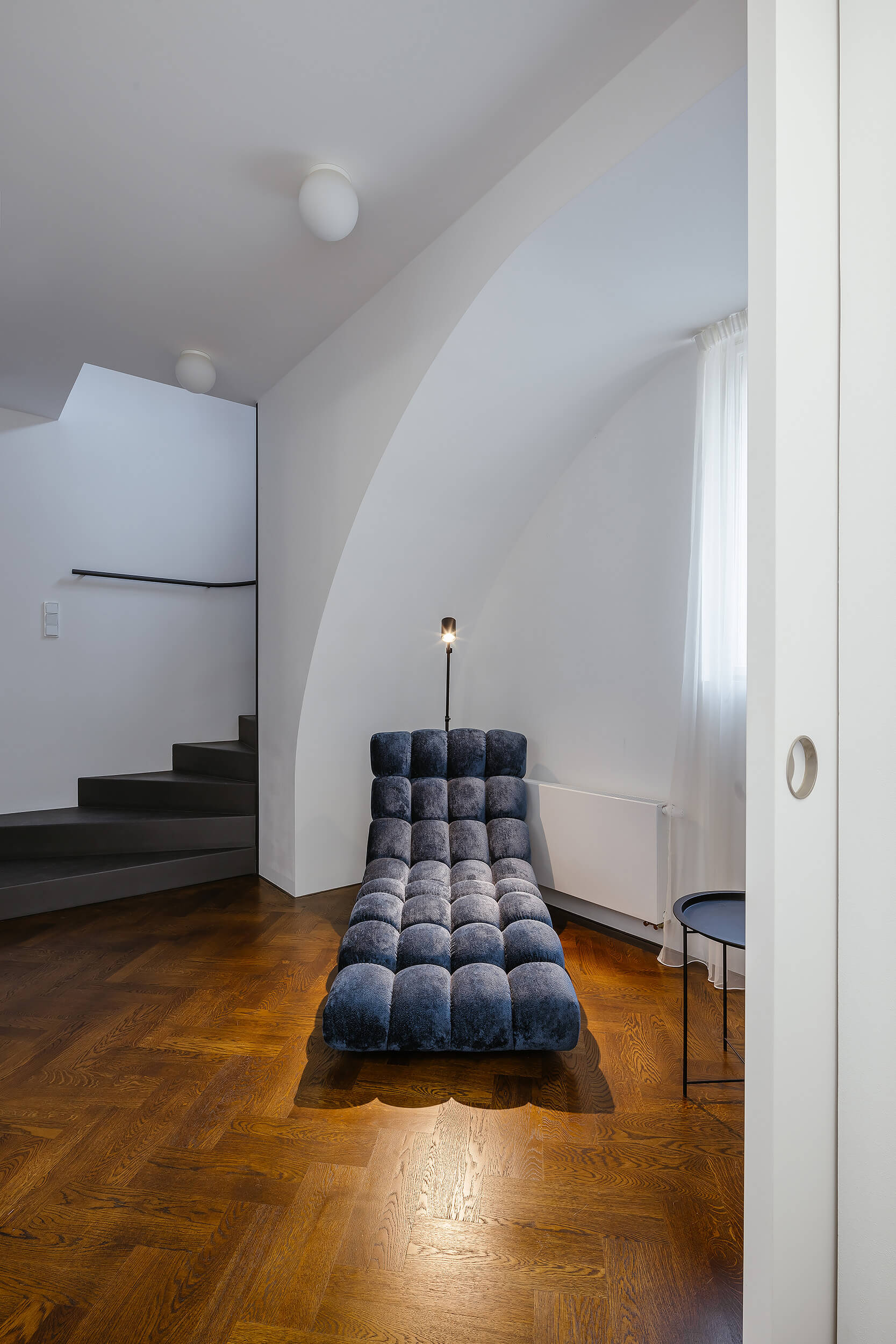 Alternativa rodinného domu na Vinohradech, třípatrový byt ve stabilní blokové zástavbě, klidné a komfortní bydlení v centru vzniklé rekonstrukcí a propojením dvou bytů, plynulé provázání prostorů, přístup světla skrz celý byt, moderní bydlení v tradičním bytovém domě.