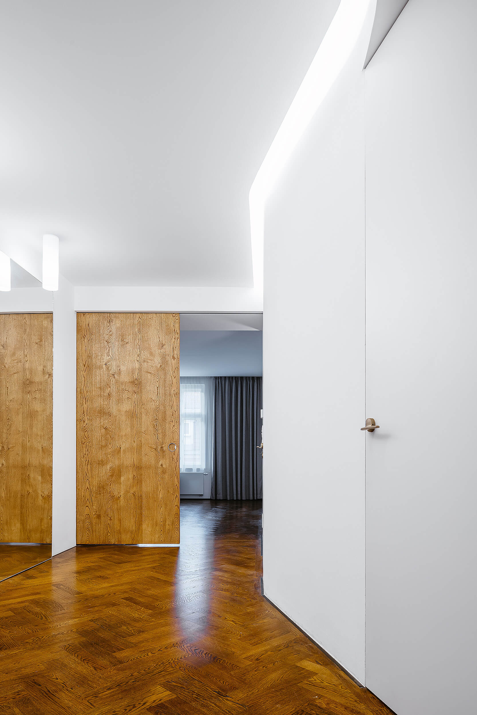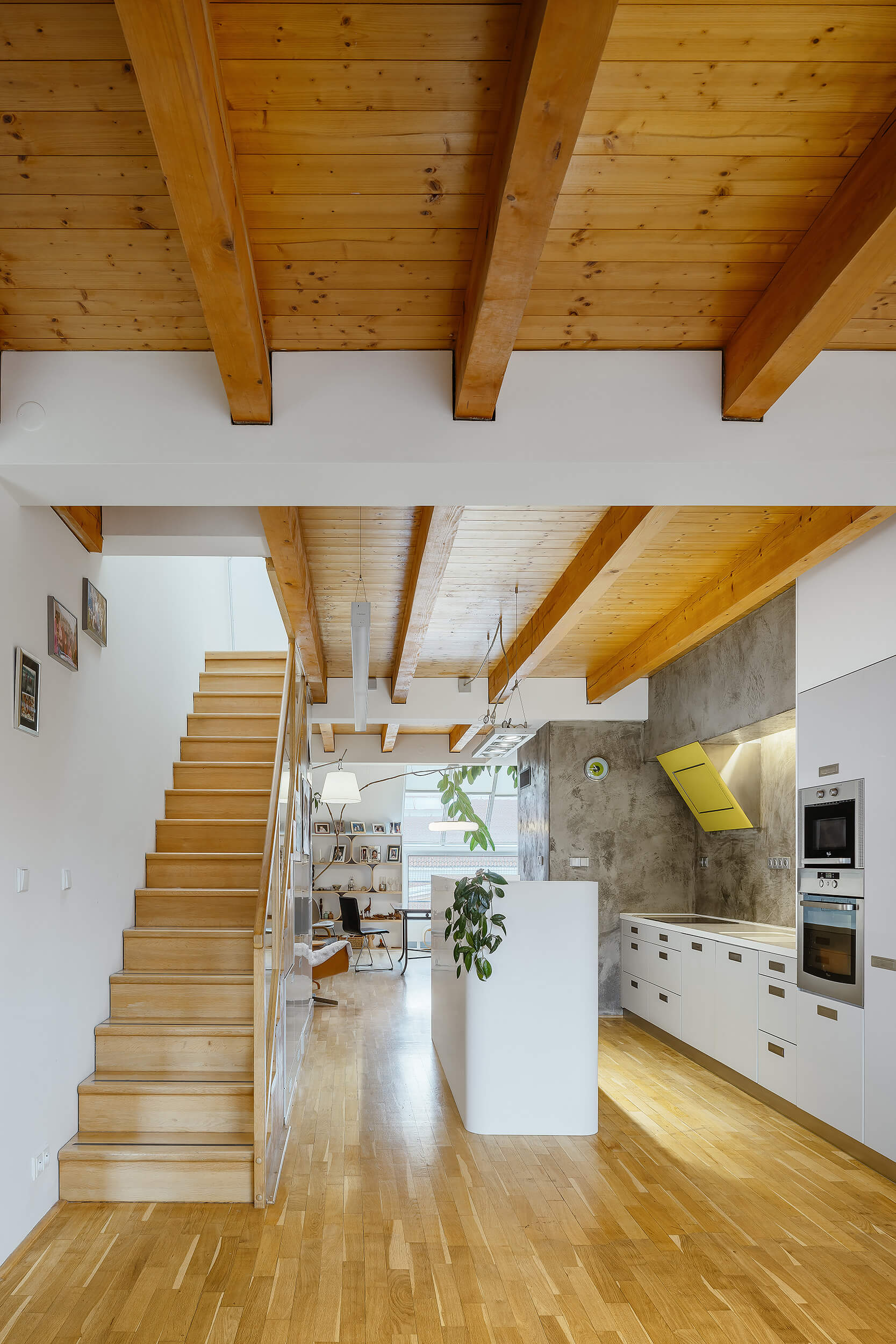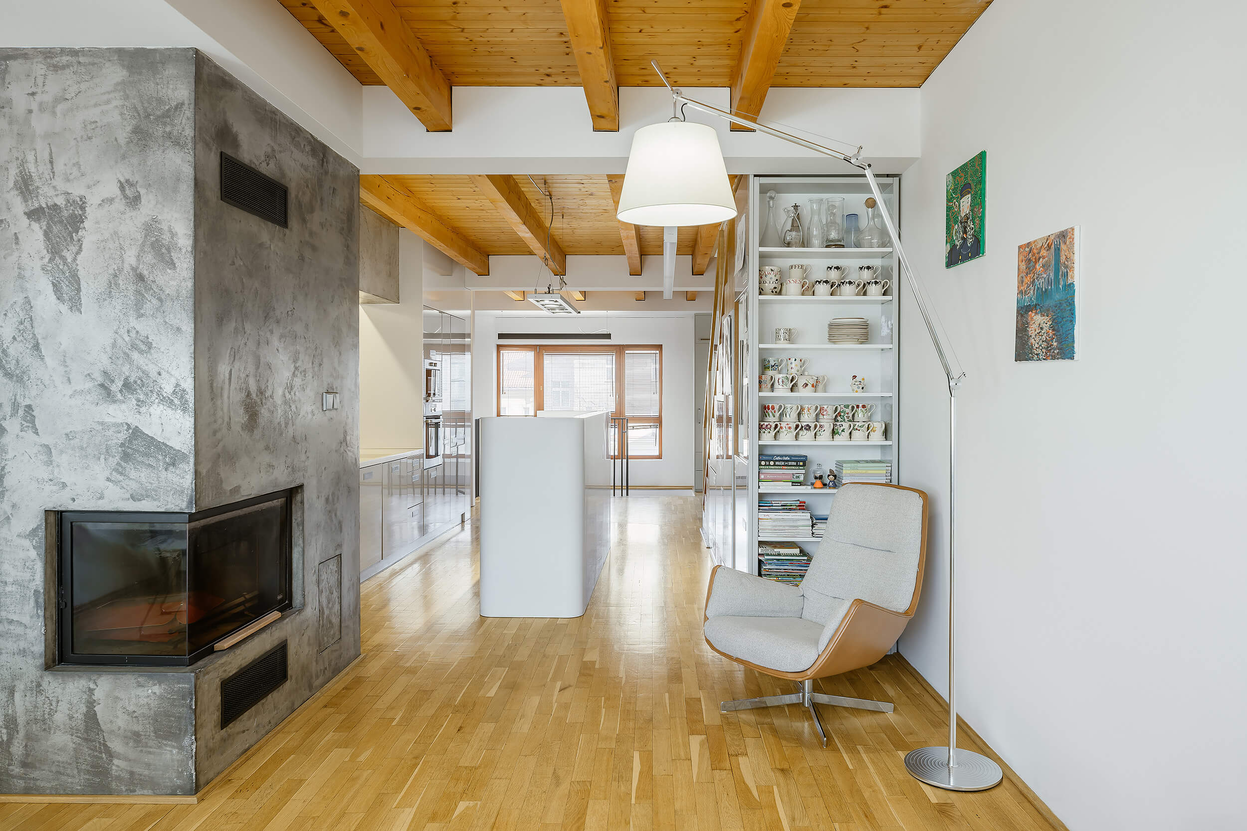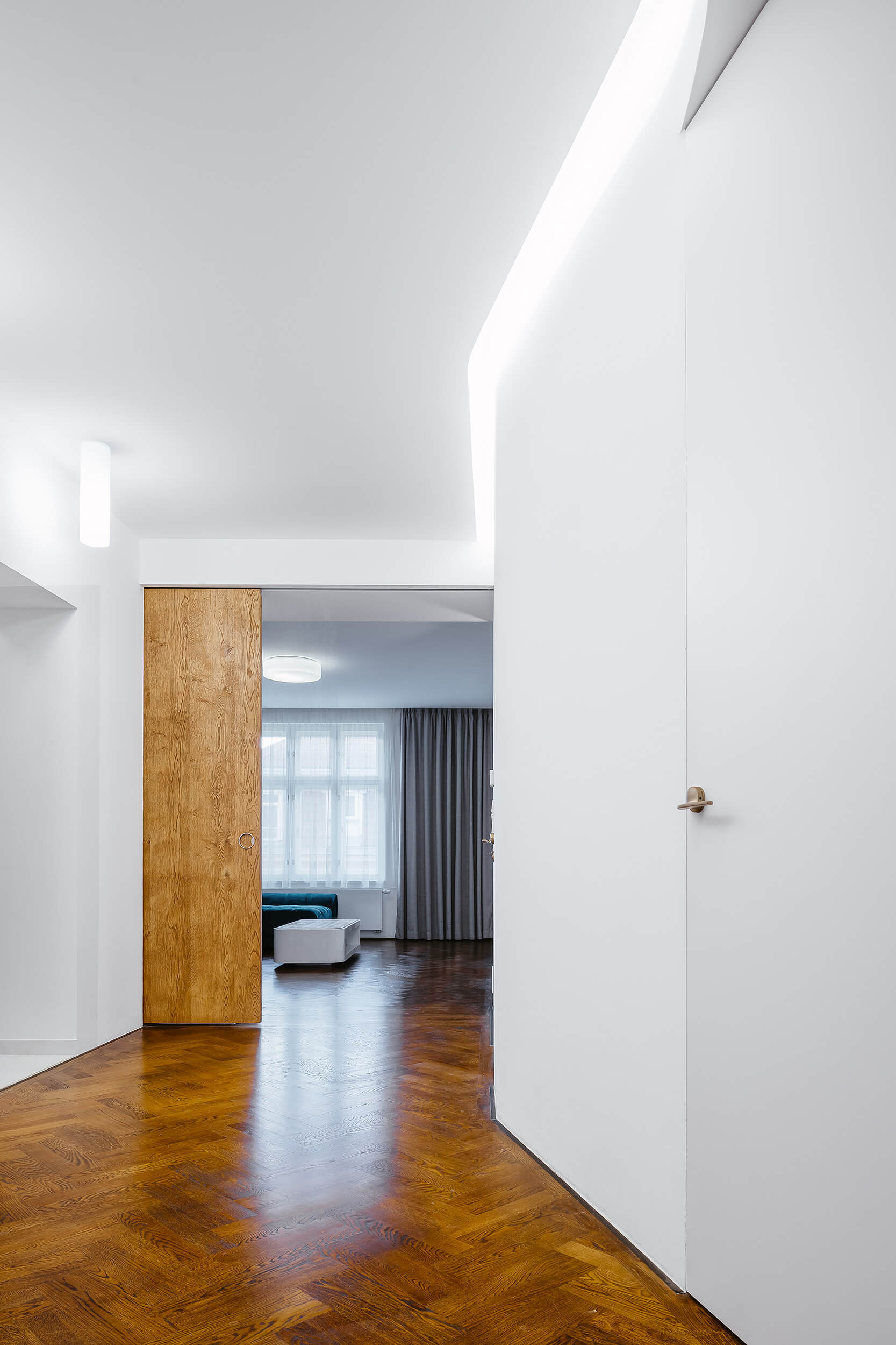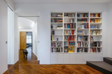 Alternativa rodinného domu na Vinohradech, třípatrový byt ve stabilní blokové zástavbě, klidné a komfortní bydlení v centru vzniklé rekonstrukcí a propojením dvou bytů, plynulé provázání prostorů, přístup světla skrz celý byt, moderní bydlení v tradičním bytovém domě.