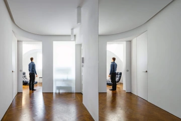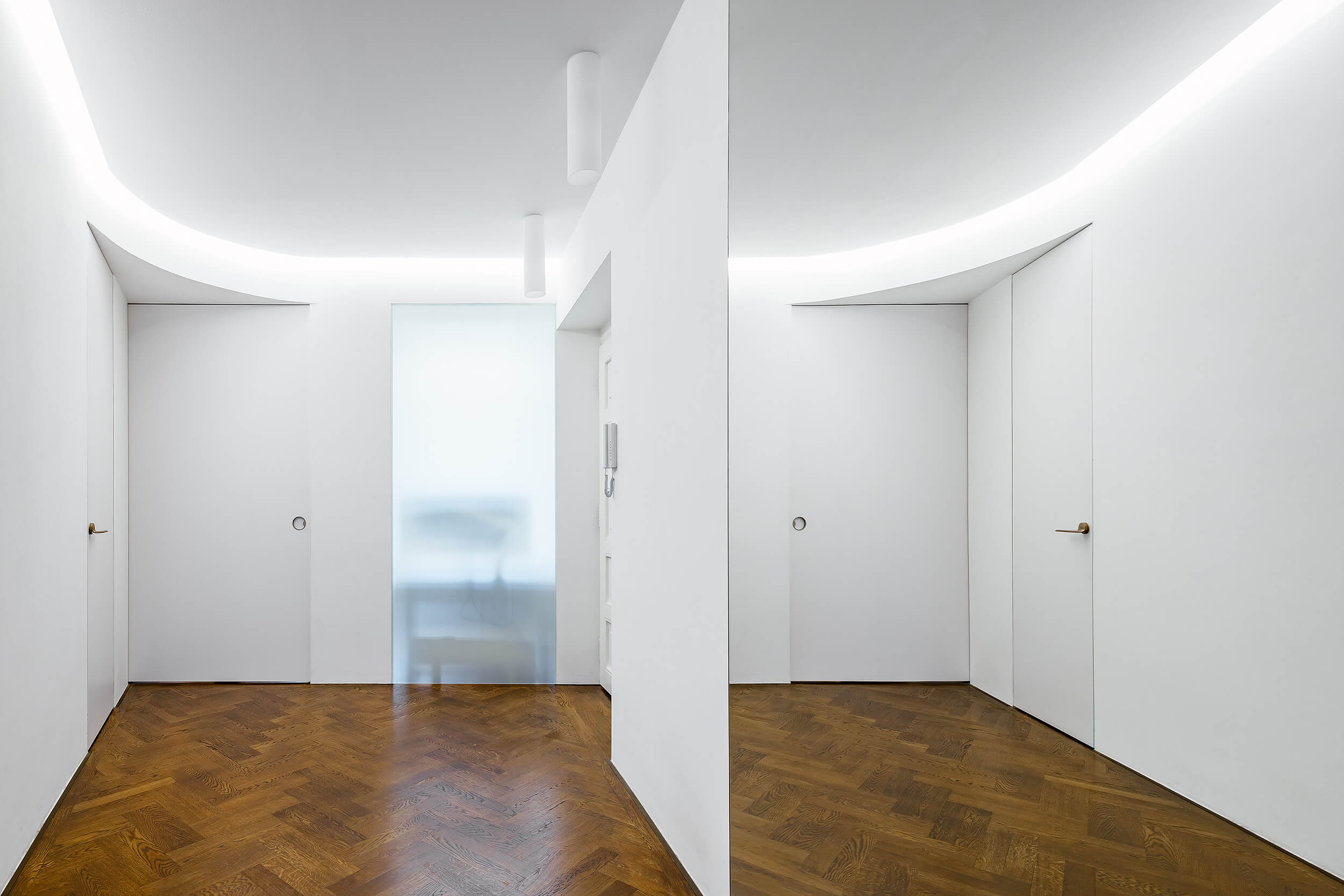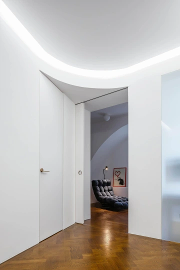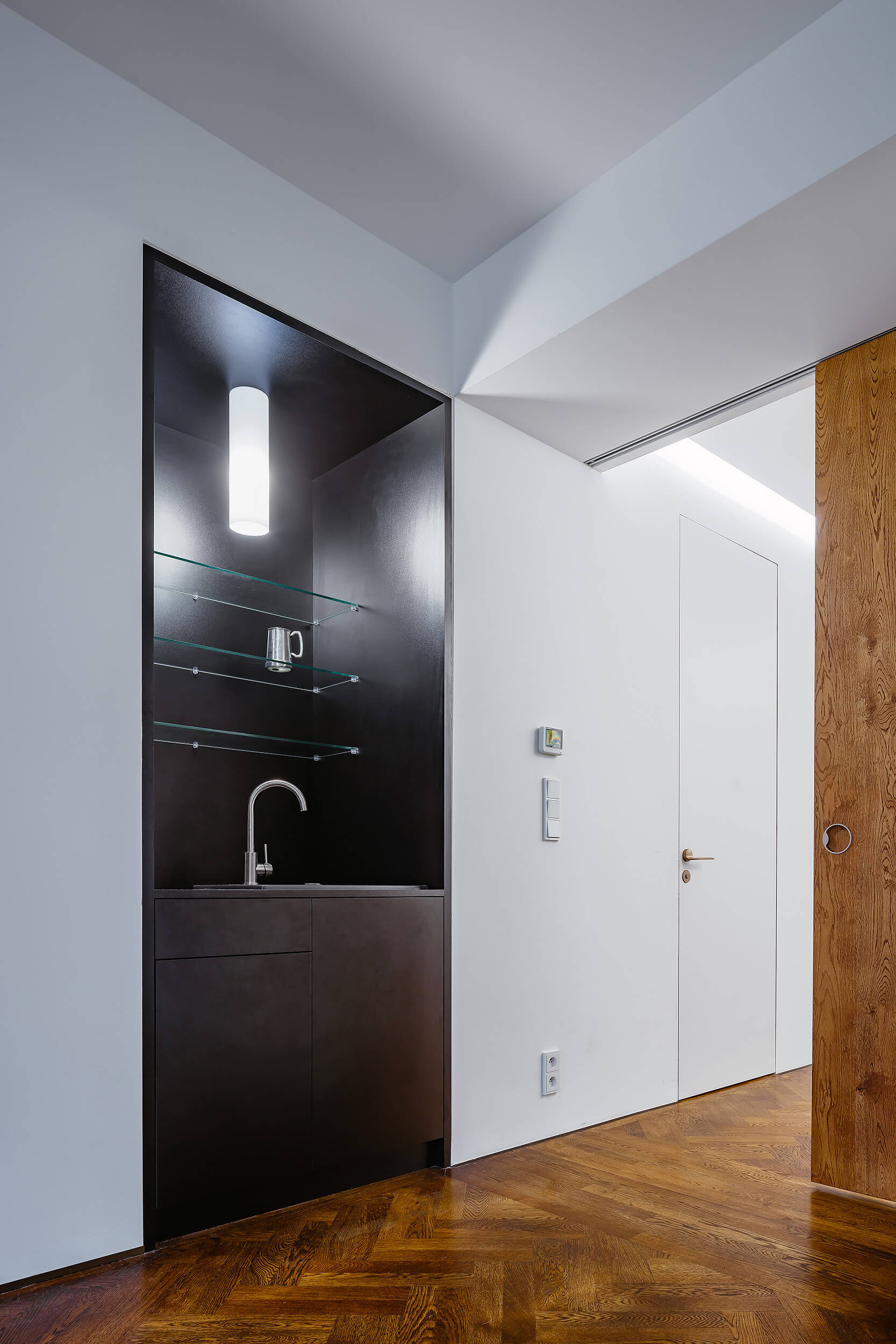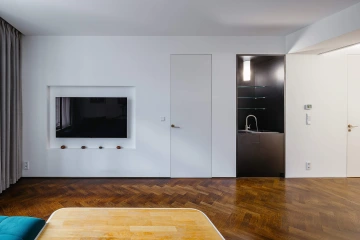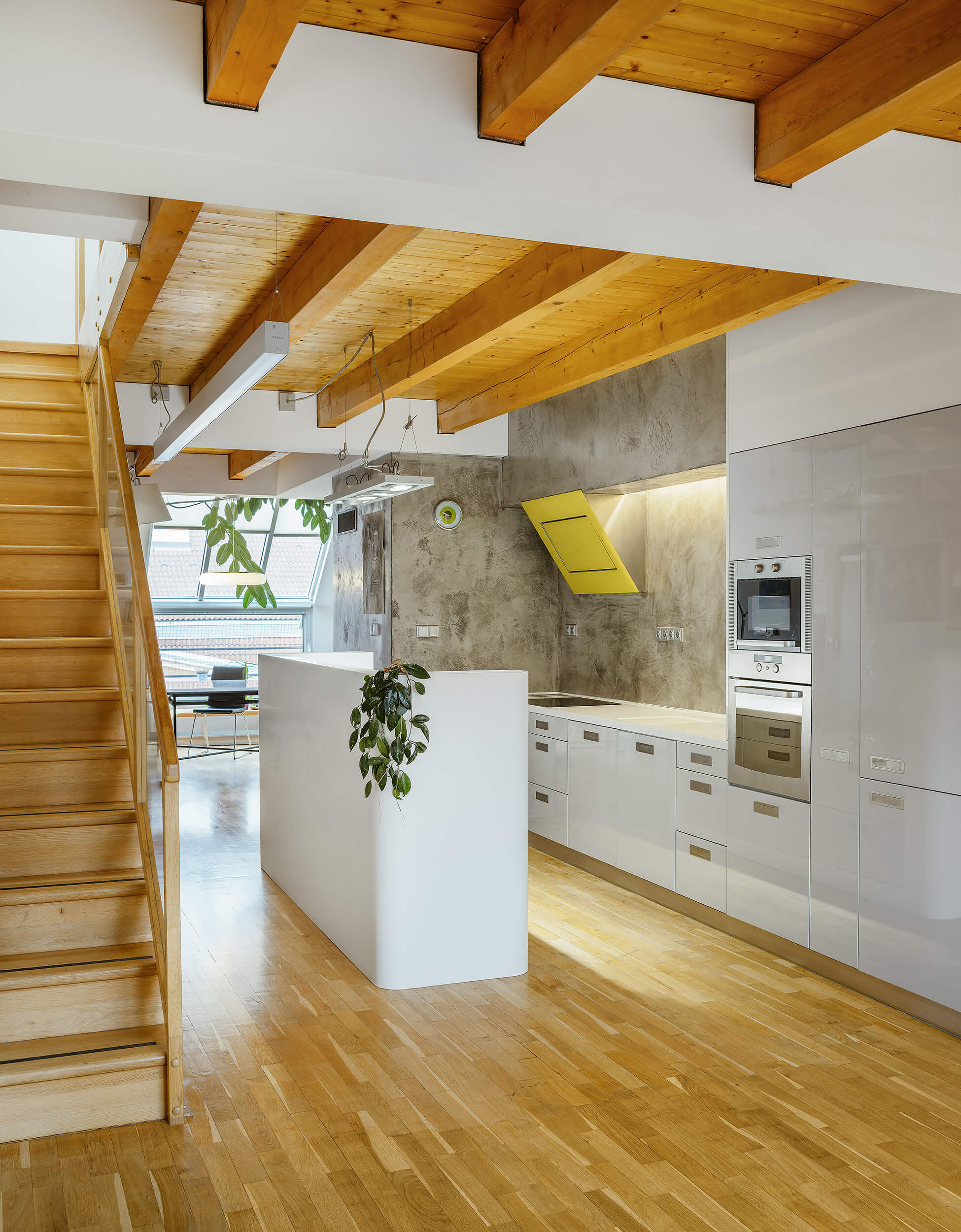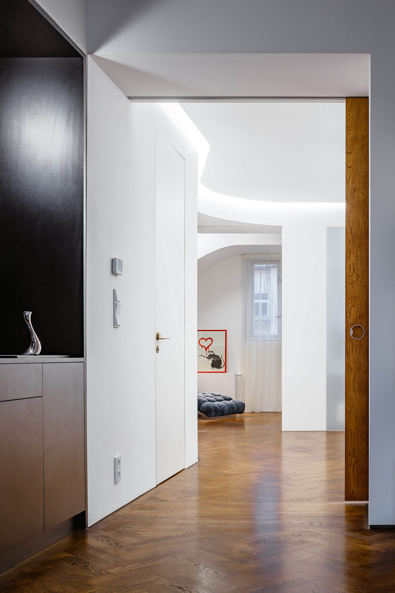 Alternativa rodinného domu na Vinohradech, třípatrový byt ve stabilní blokové zástavbě, klidné a komfortní bydlení v centru vzniklé rekonstrukcí a propojením dvou bytů, plynulé provázání prostorů, přístup světla skrz celý byt, moderní bydlení v tradičním bytovém domě.