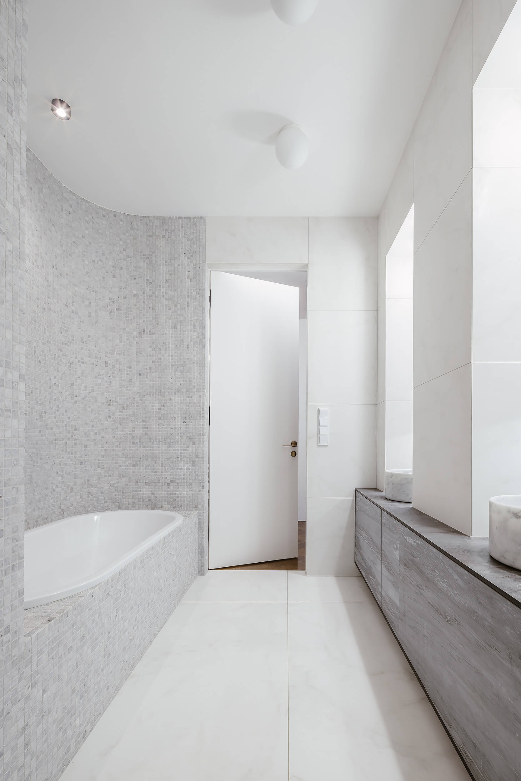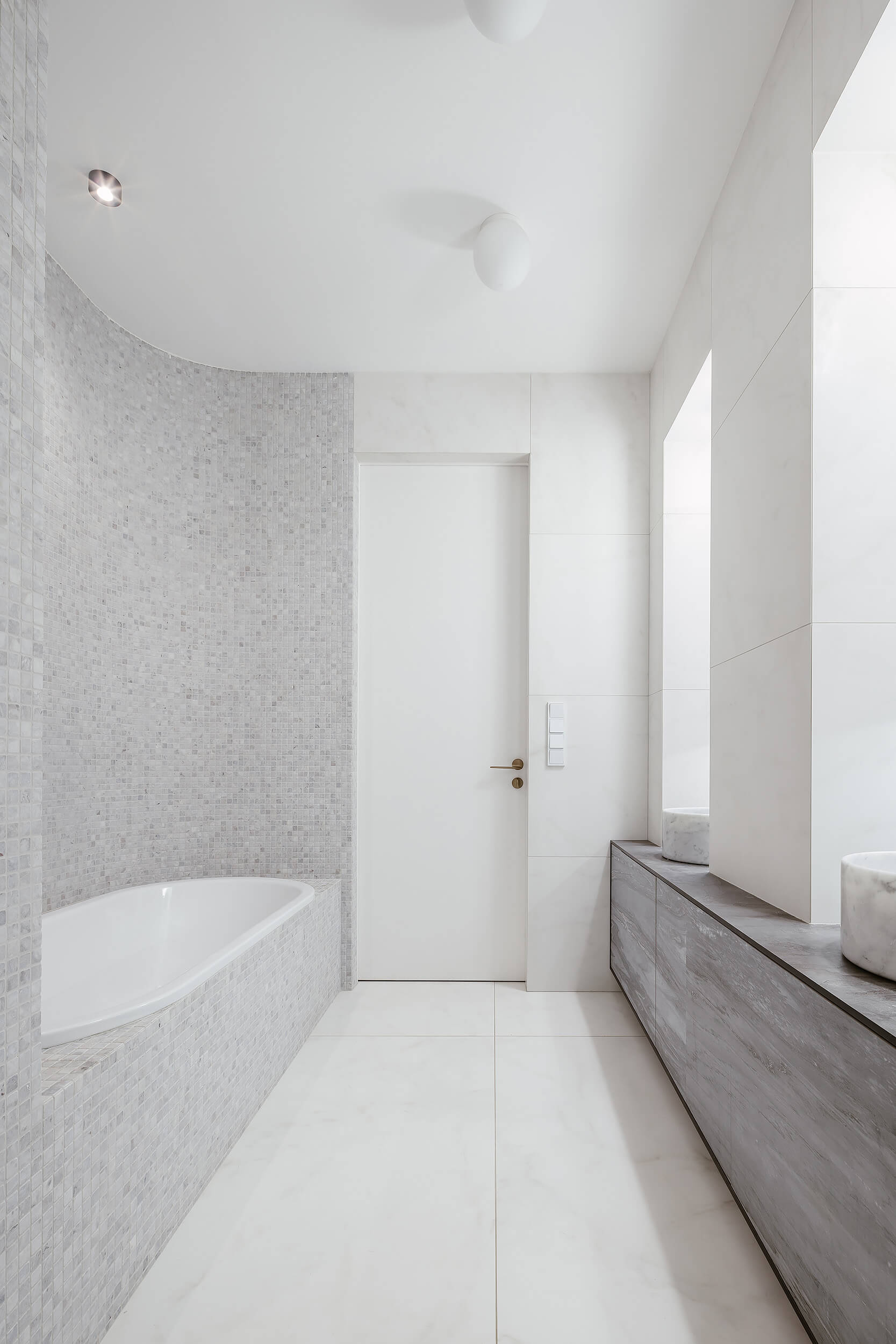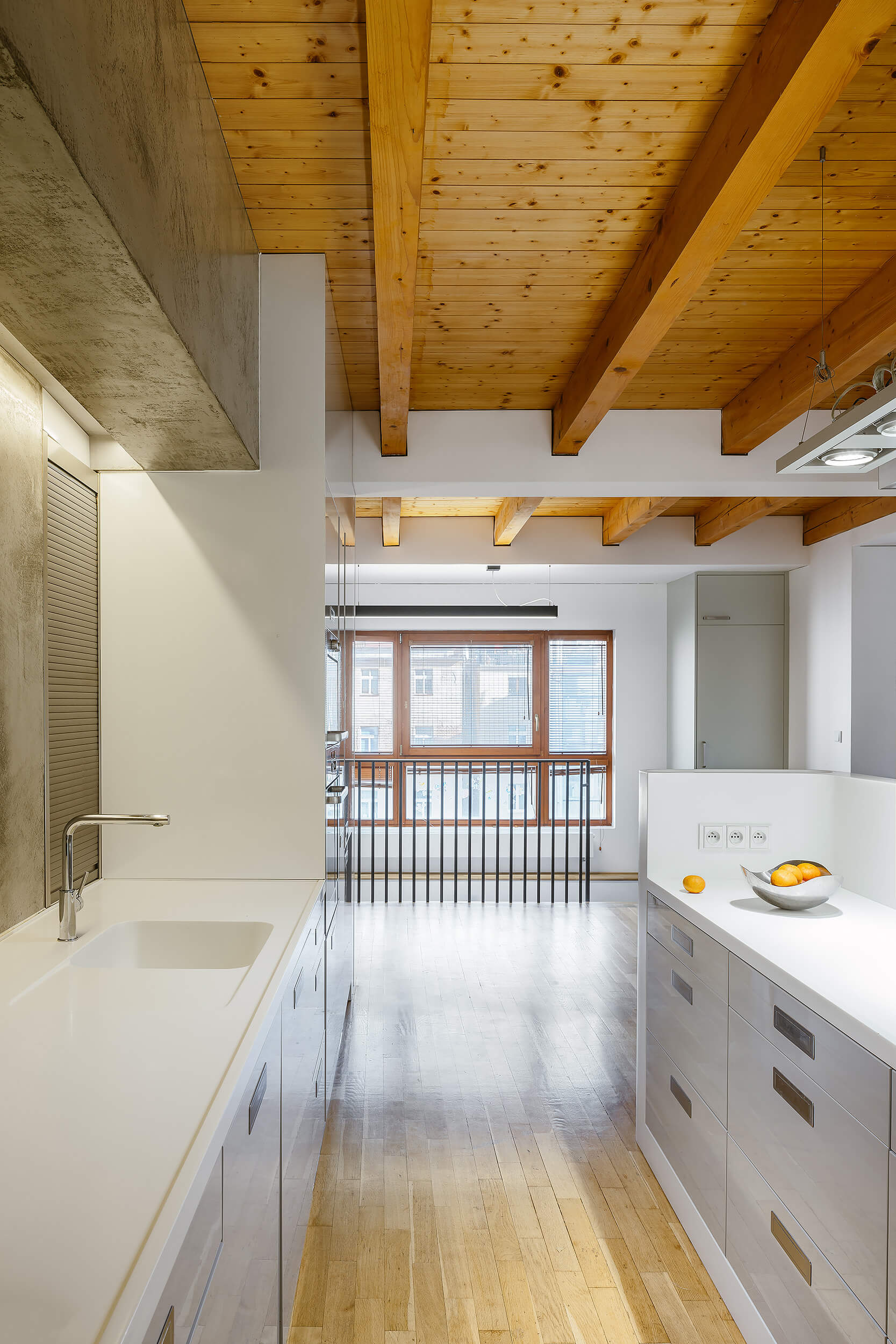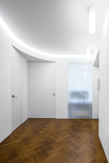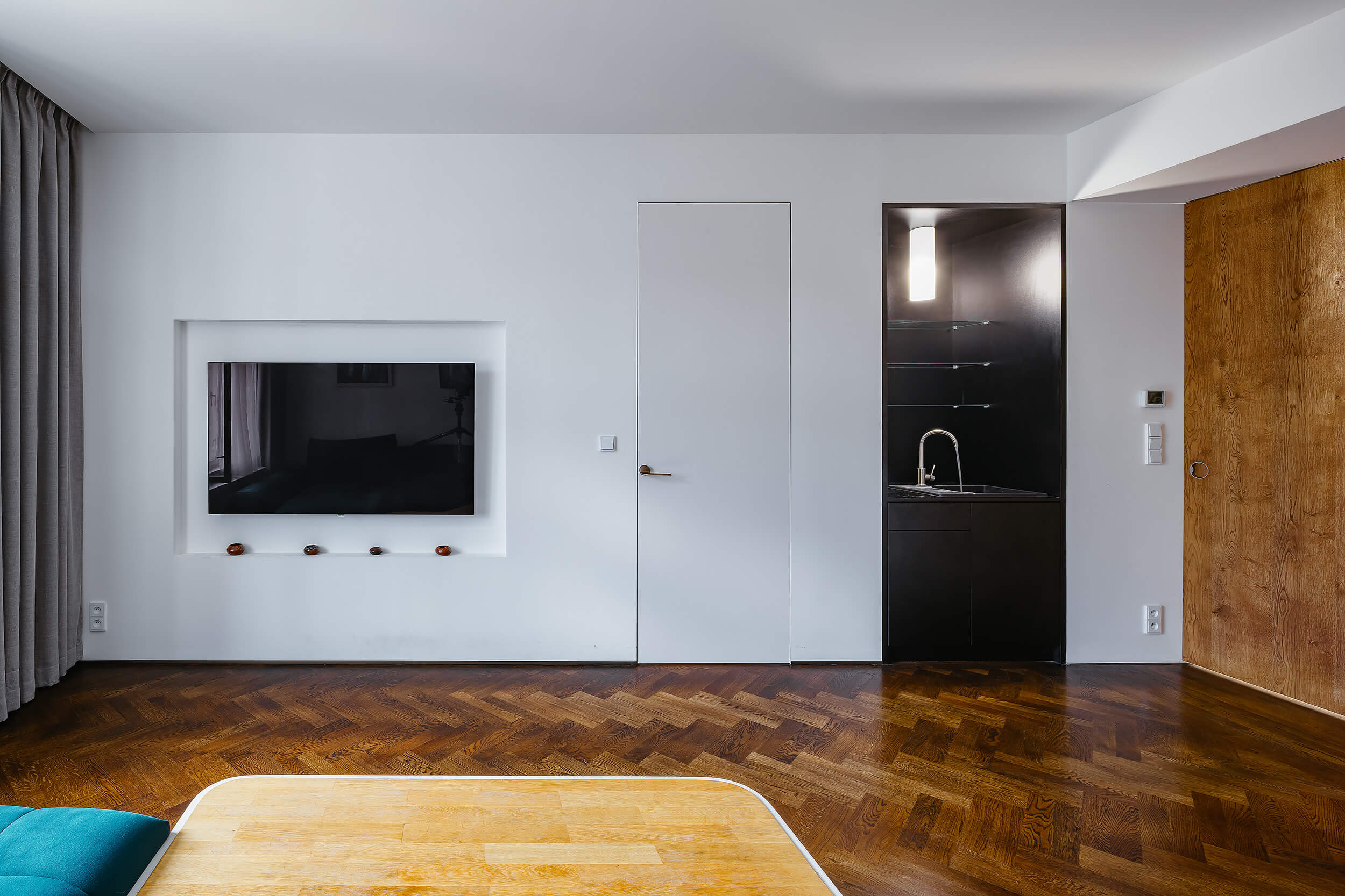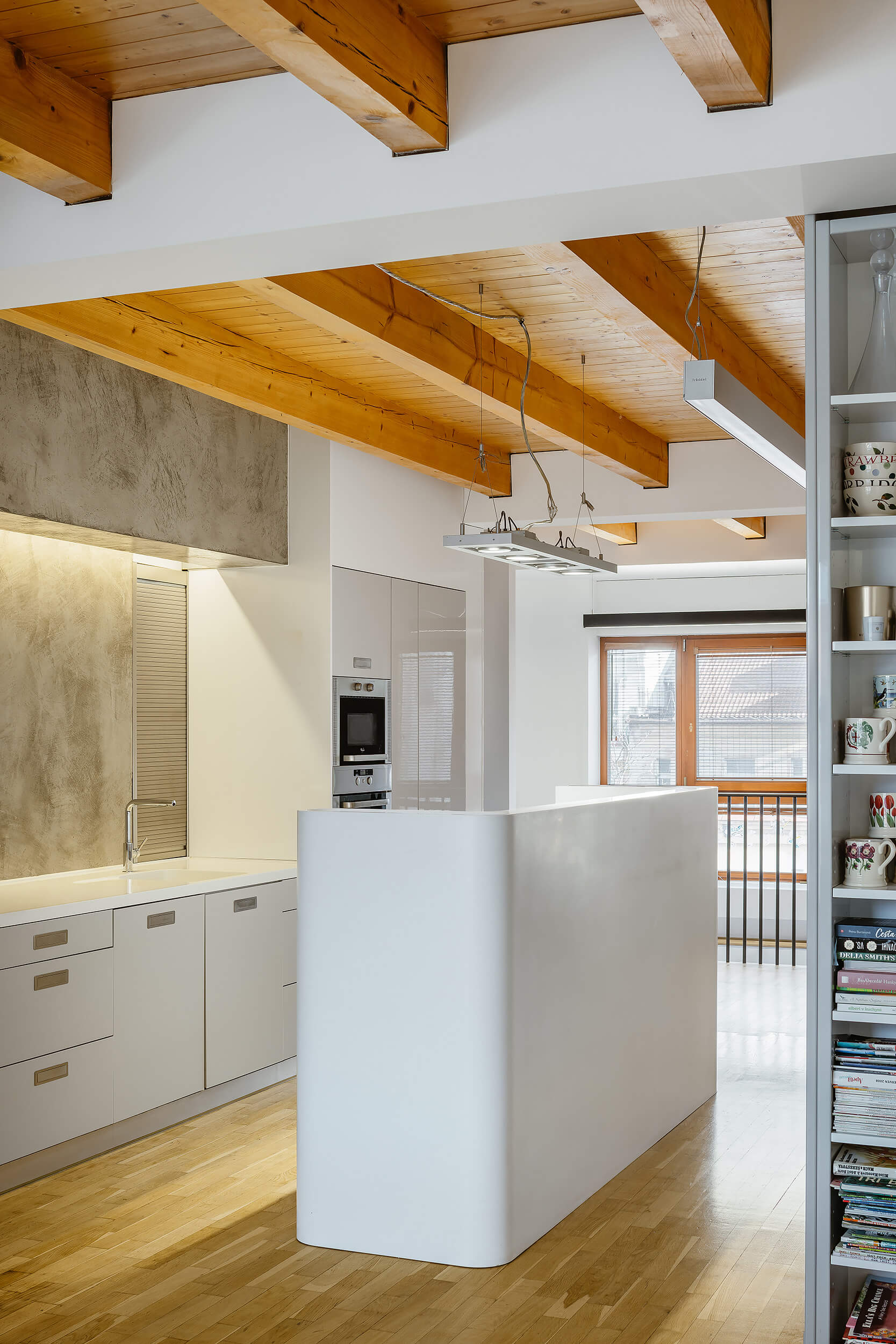 Alternativa rodinného domu na Vinohradech, třípatrový byt ve stabilní blokové zástavbě, klidné a komfortní bydlení v centru vzniklé rekonstrukcí a propojením dvou bytů, plynulé provázání prostorů, přístup světla skrz celý byt, moderní bydlení v tradičním bytovém domě.