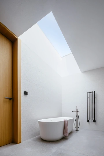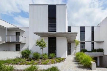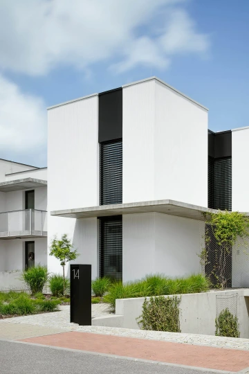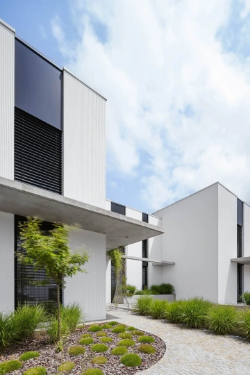 Individuální řadový rodinný dům v nové zástavbě nové části města na Vysočině, moderní komfortní bydlení v blízkosti přírody i města, tvorba rytmu ulice s ohledem na okolí, zelená zákoutí a nadstandardní soukromí, stojící v řadě, přesto z řady vystupující.